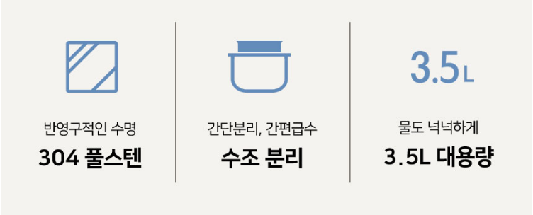 ● 품목 : 가열식가습기 ● 물통용량 : 3.5L ● 급수방식 : 상부급수형 ● 세척 : 간편세척 ● 세척가능 : 물통