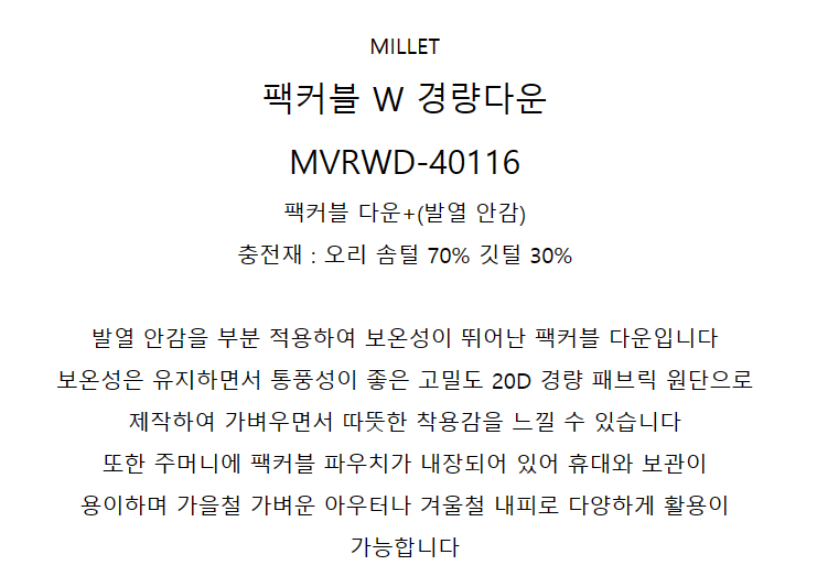 4) 밀레 경량패딩 덕다운 오리털 점퍼 간절기 팩커블 자켓