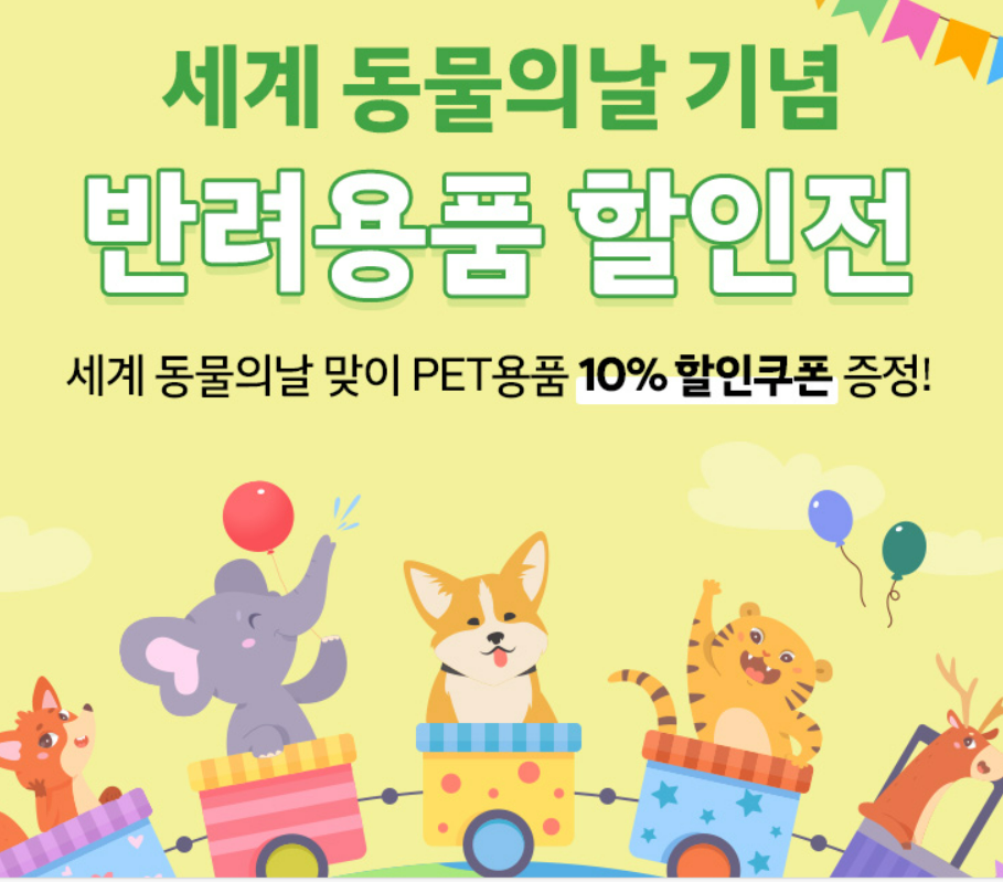 세계 동물의날 기념 반려용품 할인전을 갖습니다. 행사기간 10/4~10/31까지 pet용품 10% 할인쿠폰을 증정하니 반려동물을 키우시는 분들은 아래에서 살펴보시고 할인쿠폰 적용받아 바로 이용하세요.
